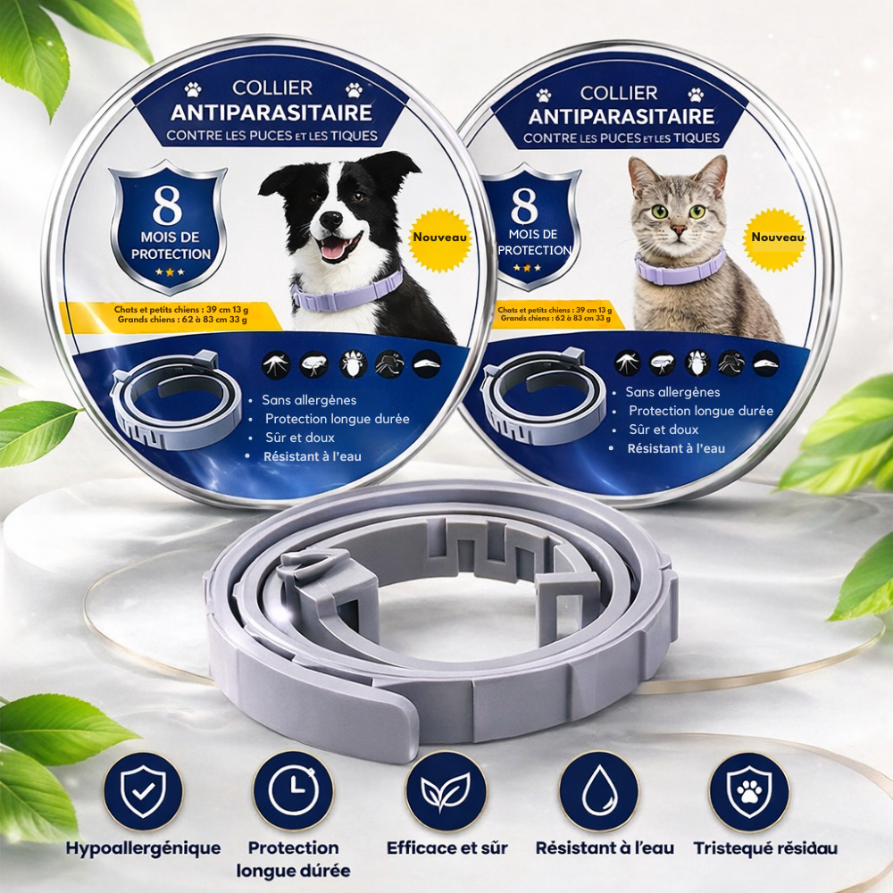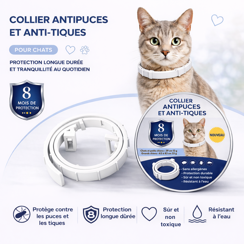 Ce collier offre une protection longue durée pouvant aller jusqu’à 8 mois, ce qui en fait un choix pratique et économique. Il libère progressivement des substances actives qui aident à repousser les puces, les tiques et les moustiques, tout en restant doux pour la peau de votre animal.